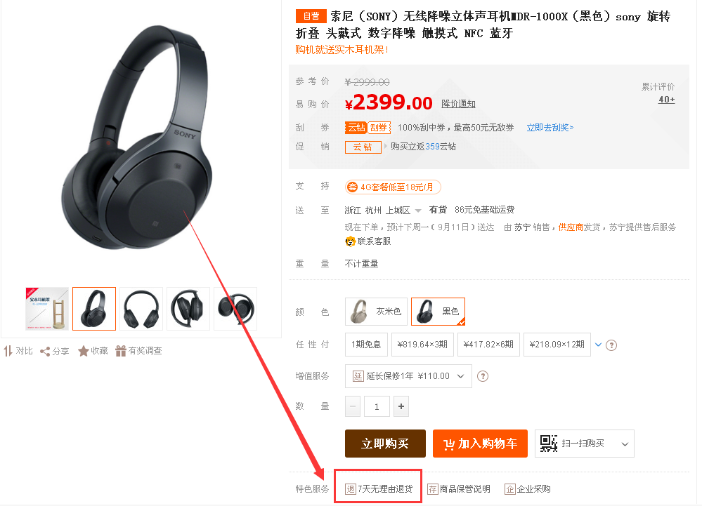 (图注:搜索同款耳机苏宁与天猫仍支持7天无理由退换)