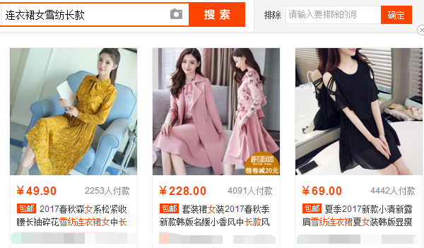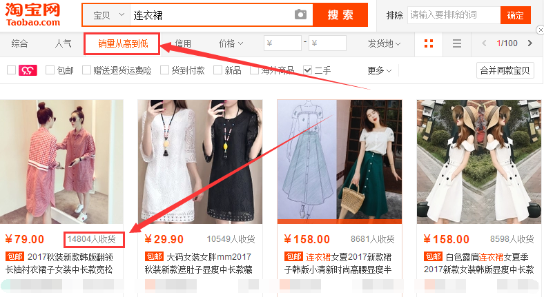 在这里,大家可以去搜索一下。比如说“连衣裙女”然后我们去按照销量进行排序。而我们看到的销量最多的是14000多的销量。但是,长尾词你就会发现只需要5000多的销量就可以去排到第一页了。