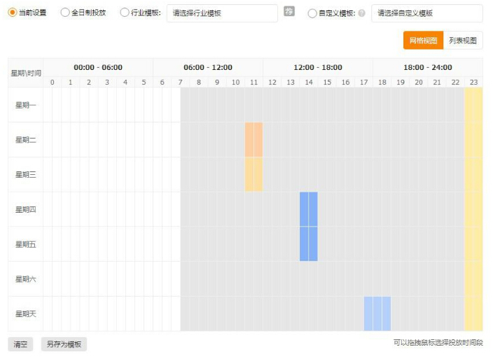 3、自定义模板:掌柜可以根据自己的店铺转化高峰期,或者引流高峰期自定义设置时间折扣比例,但是在设置时间折扣会存在一个误区,就是很多掌柜会在同一个时间段一个周期设置为同样的折扣。比如通过数据统计7天内晚上21点转化表现最好,掌柜就会把7天晚上21点设置为同样的折扣。其实7天内同一时间段都会有高有底,好比做办公用品的类目,周一到周五的早上跟下午的转化跟人流好,但是周六周日就不行了。所以必须要根据实际数据统计在设置分时折扣。
