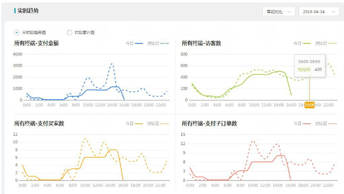 4、如何统计一个周期内转化或者人流高的时间段呢?来到生意参谋找到实时---实时概况,进入页面下拉找到实时趋势模块,这里可以对比最近3个月的访客、转化数据,掌柜只需统计14天的数据即可