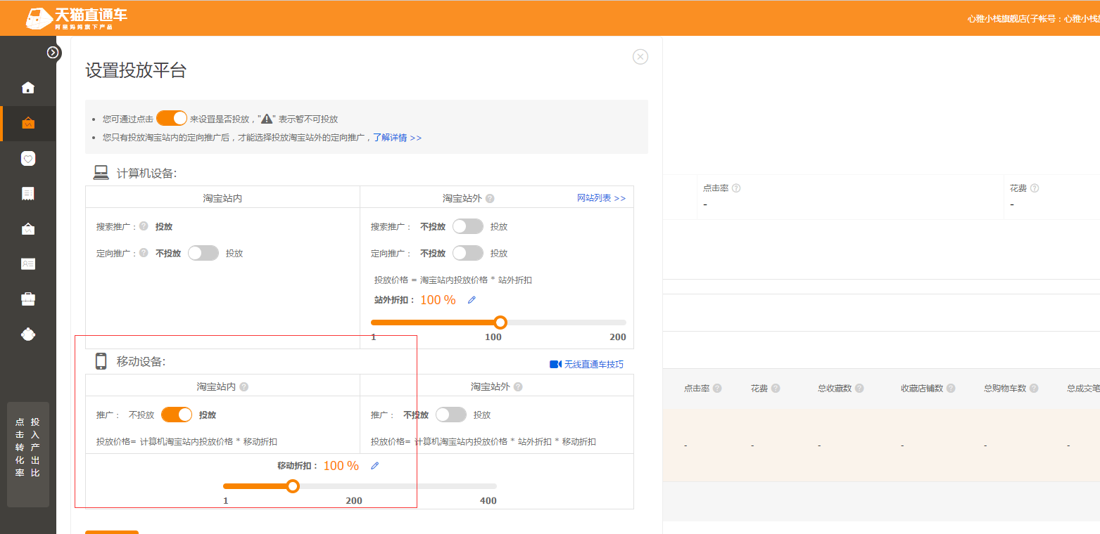 对于新店来说我们只选择移动站内,因为站内的流量是最精准的。站外的流量只是展现在一些网站不痛不痒的地方我们没必要因为这个花那个冤枉钱,所以前期不考虑,那么我们把pc端和手机端的站外推广全关闭。那么pc端的定向推广也关闭,因为我们前期流量都不够人物画像和人群标签,根本不精准。所以这个暂时是无用的,关闭。但是一些老店,小众类目的店铺投放到站外定向推广。设置的折扣默认为100%