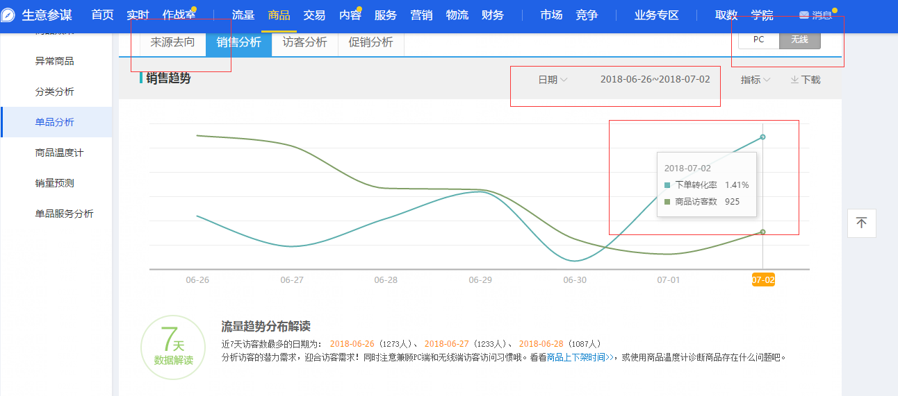 商品效果-单品分析,看我们的主推宝贝,选择销售分析,无线端,看最近七天我们的宝贝高销量的天数,看宝贝周几转化率高,访客数高,结合之前的全天时间段提高时间折扣